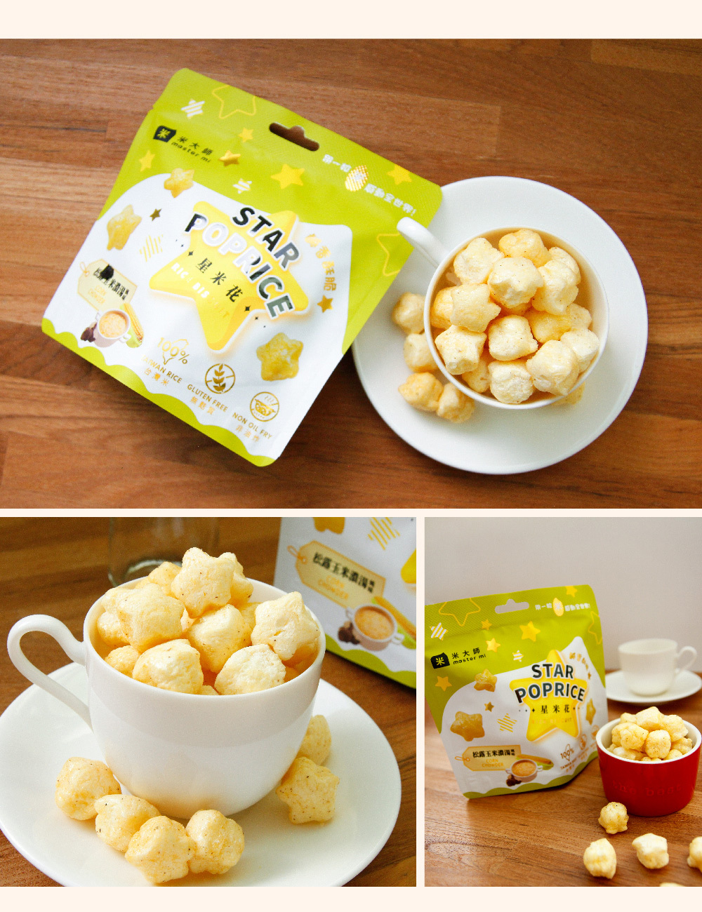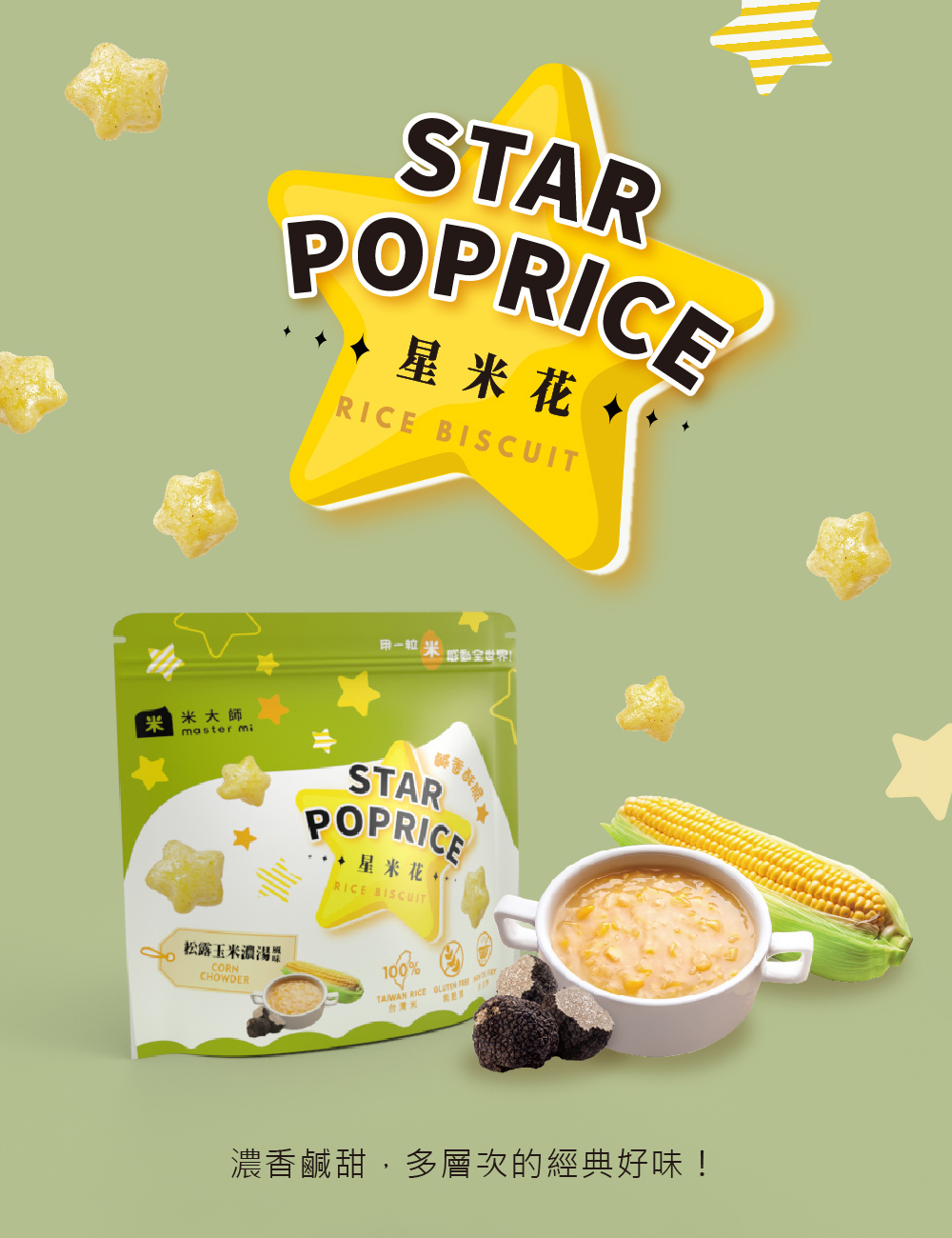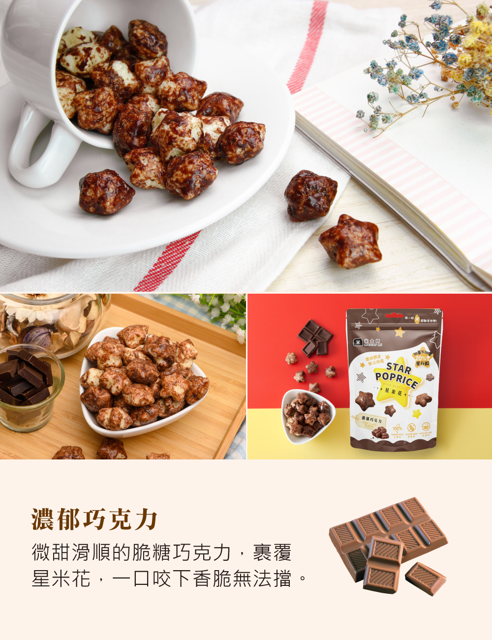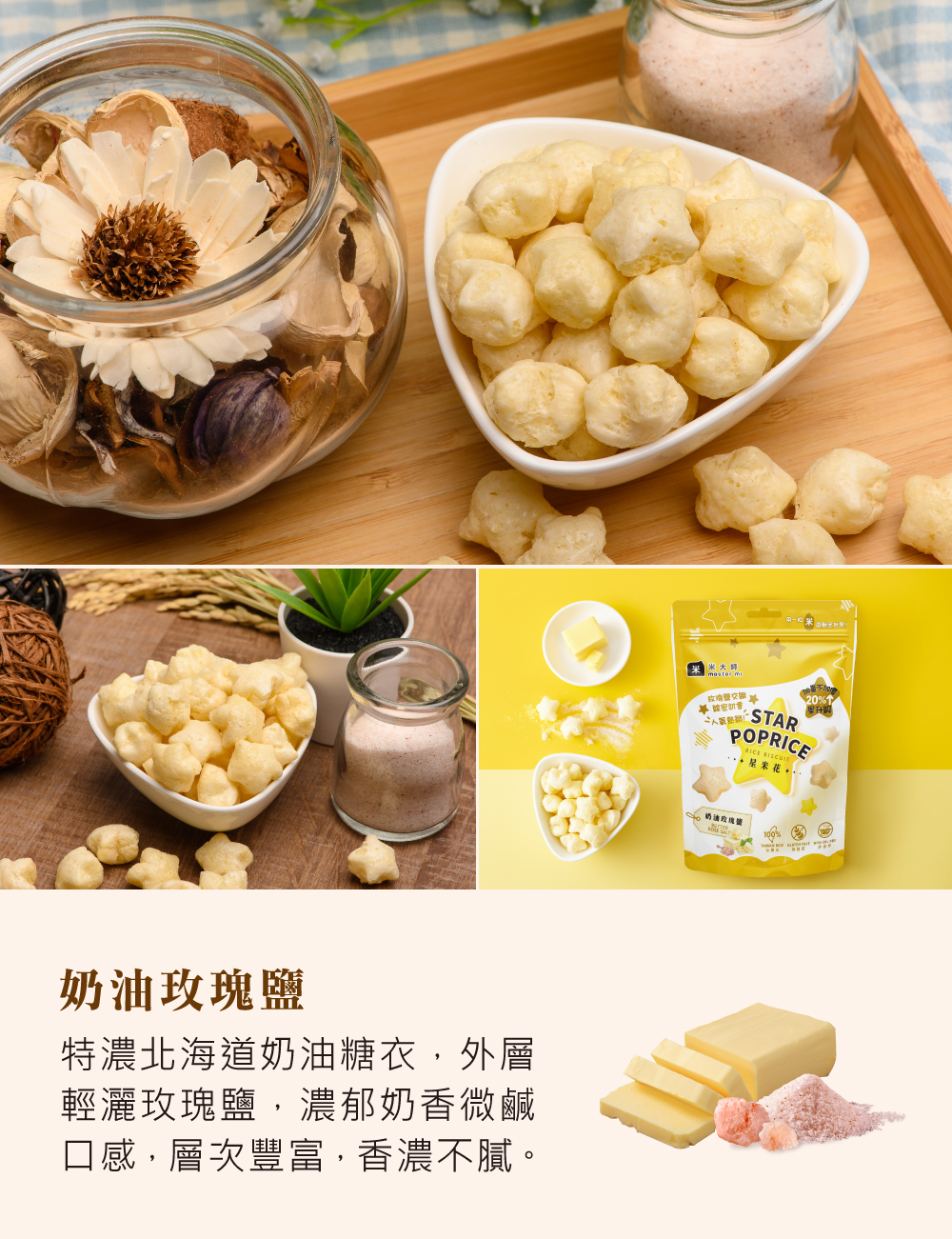★禮盒內容:星米花(濃郁巧克力X1、奶油玫瑰鹽X1、沖繩黑糖X1、蒜香起司X2、松露玉米濃湯X2),共7包