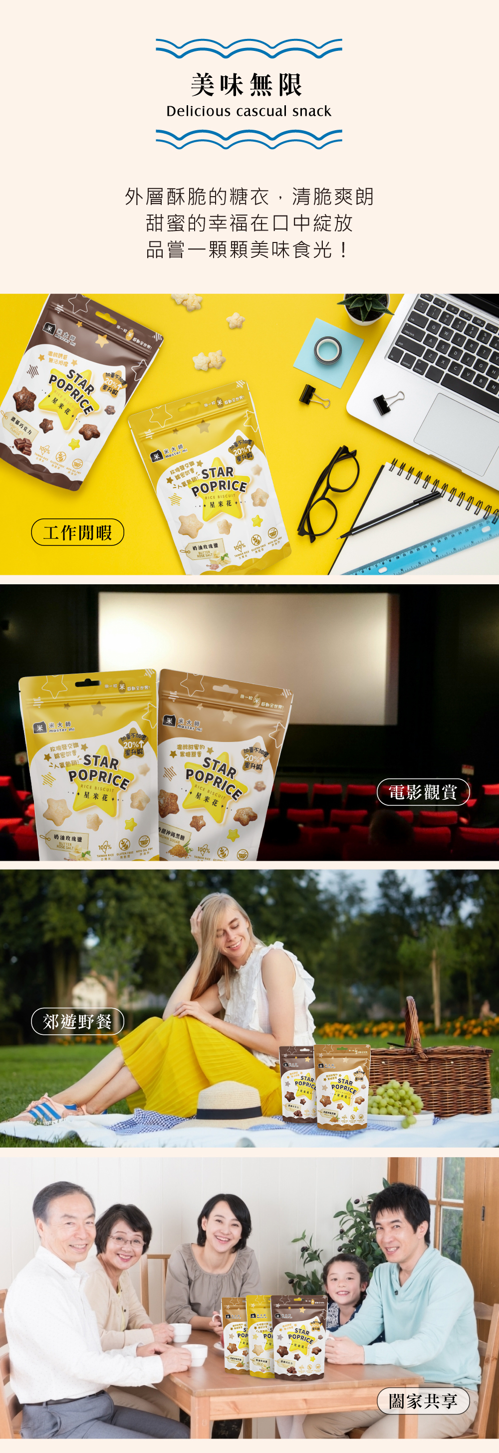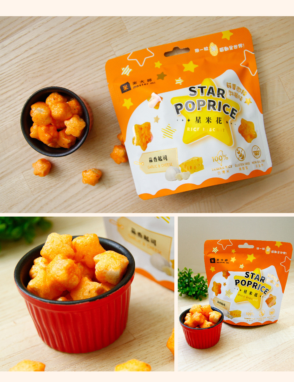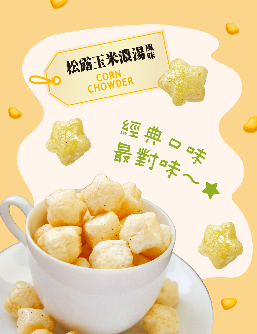 ★禮盒內容:星米花(濃郁巧克力X1、奶油玫瑰鹽X1、沖繩黑糖X1、蒜香起司X2、松露玉米濃湯X2),共7包