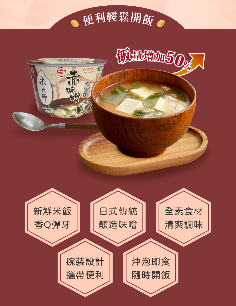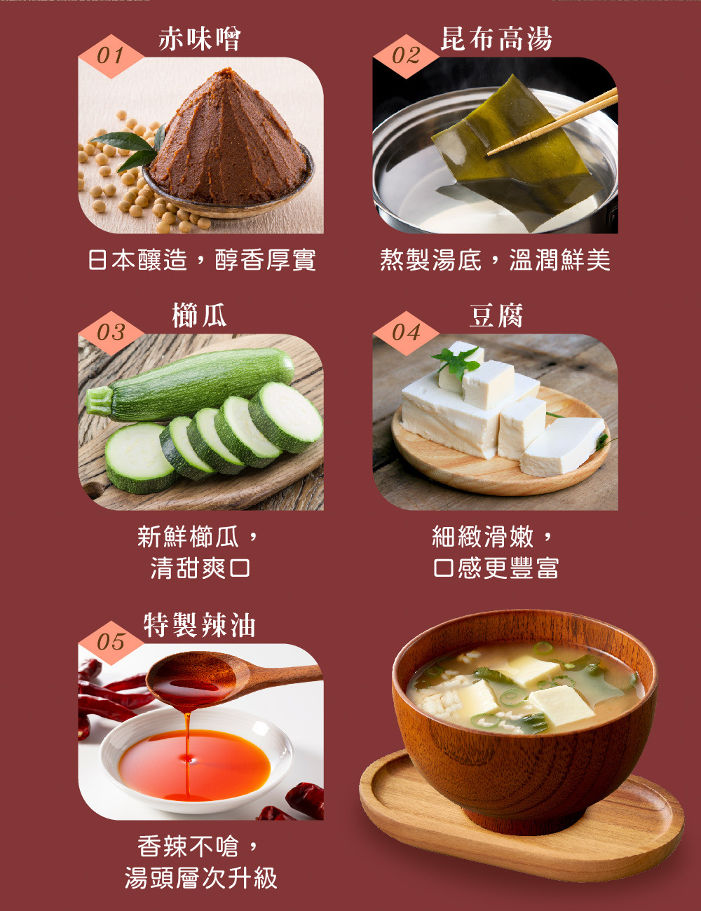 嚴選日本傳統釀造赤味噌,搭配滑嫩豆腐與蔬菜,湯頭濃厚香醇。另附辣油,可依喜好加入,微辣不嗆口,香氣風味層次再提升!全素食的暖心湯飯!
