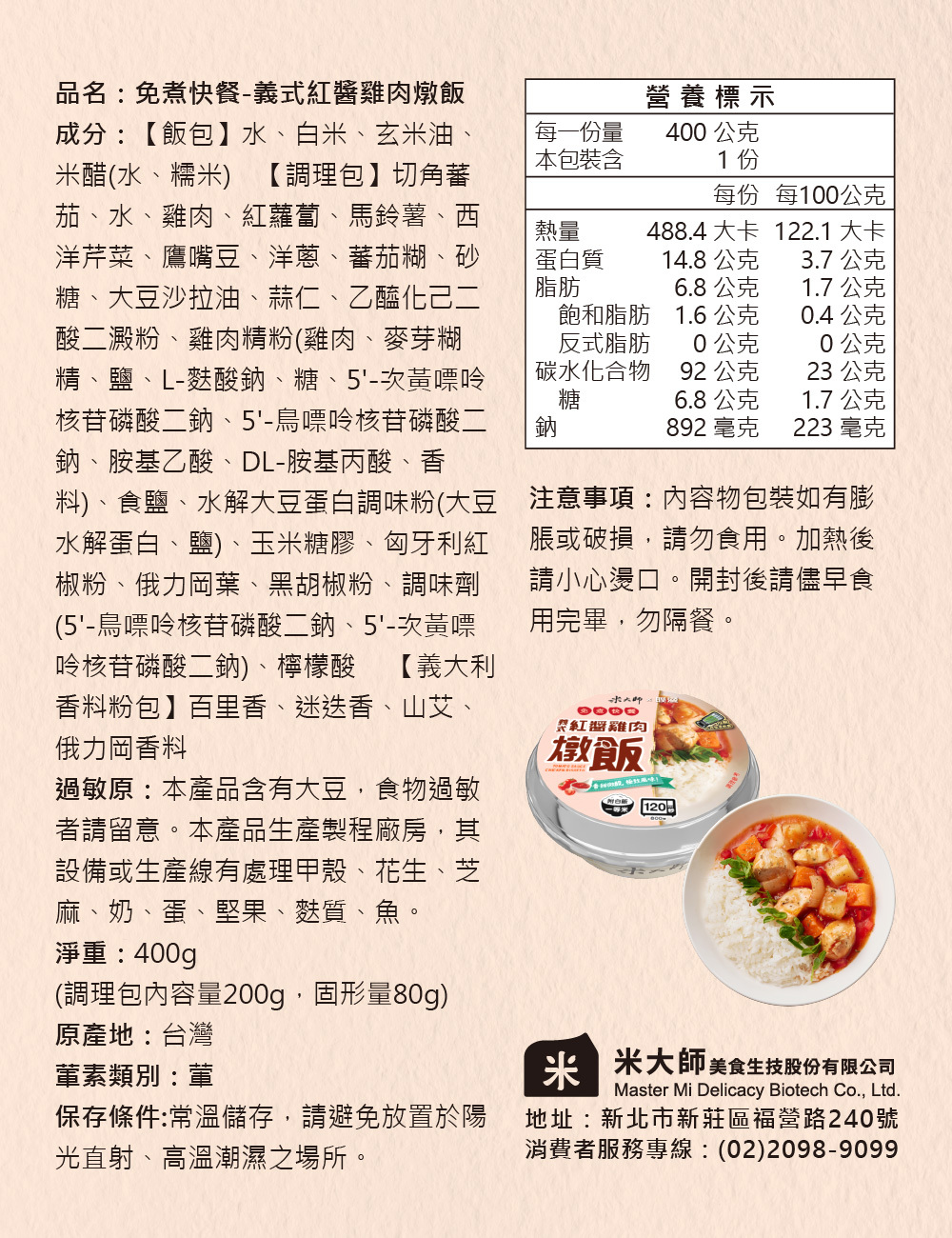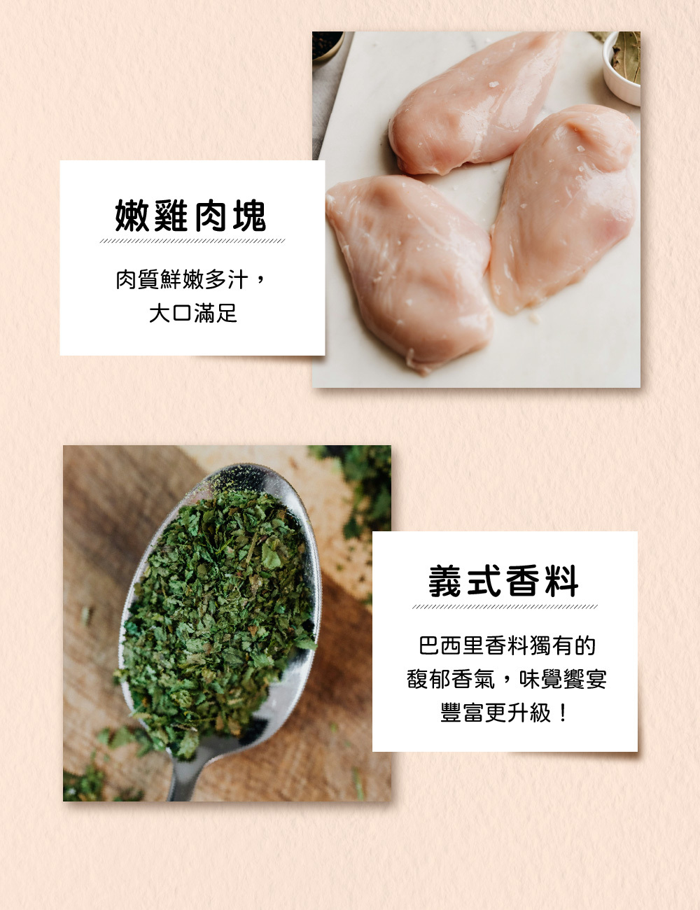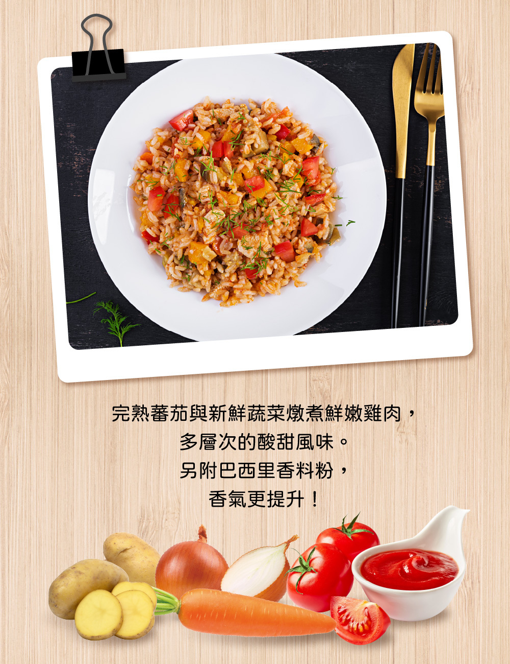 完熟蕃茄與新鮮蔬菜燉煮鮮嫩雞肉,多層次的酸甜風味。另附巴西里香料粉,香氣更提升!